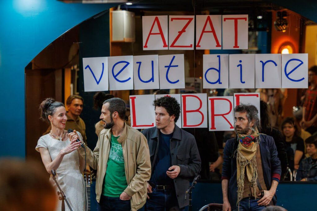Une dizaine d’adhérents de Solidarité FreeAzat sont présents avec des membres du bureau de l’association, pour présenter l’association au cours d’un événement organisé à Montmartre par Mikhail Lobanov.