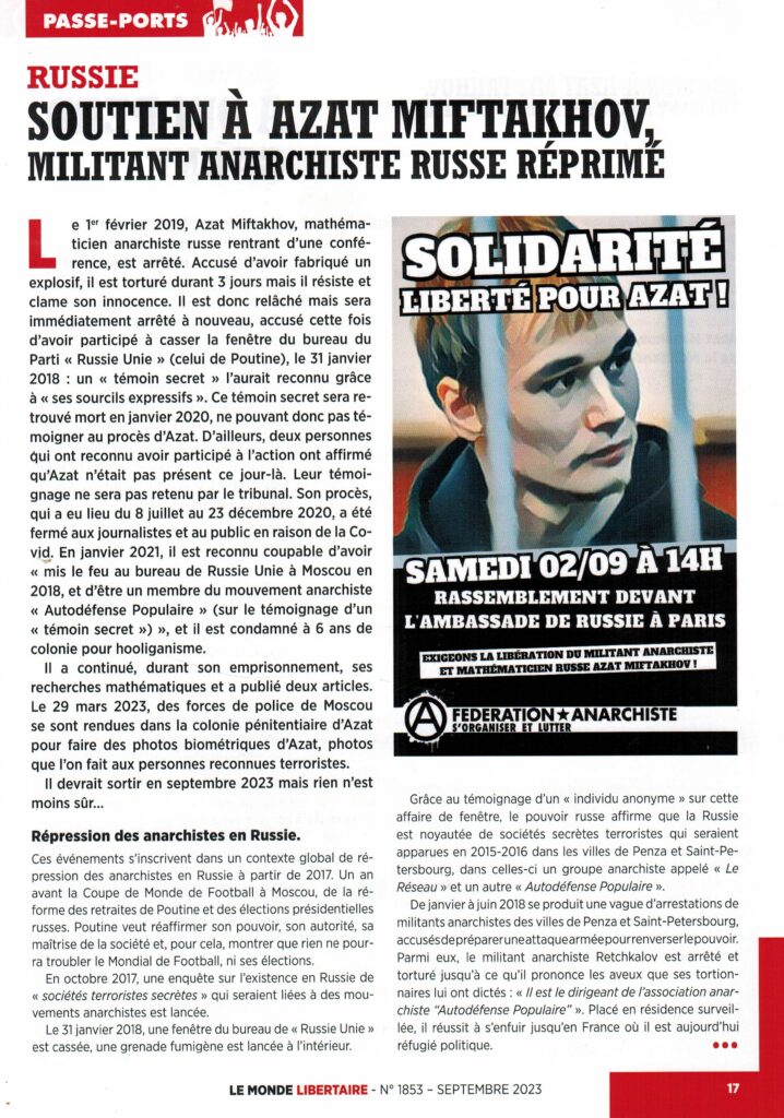A-Infos (fr) Monde Libertaire – Samedi 2 septembre. Liberté pour Azat Miftakhov!